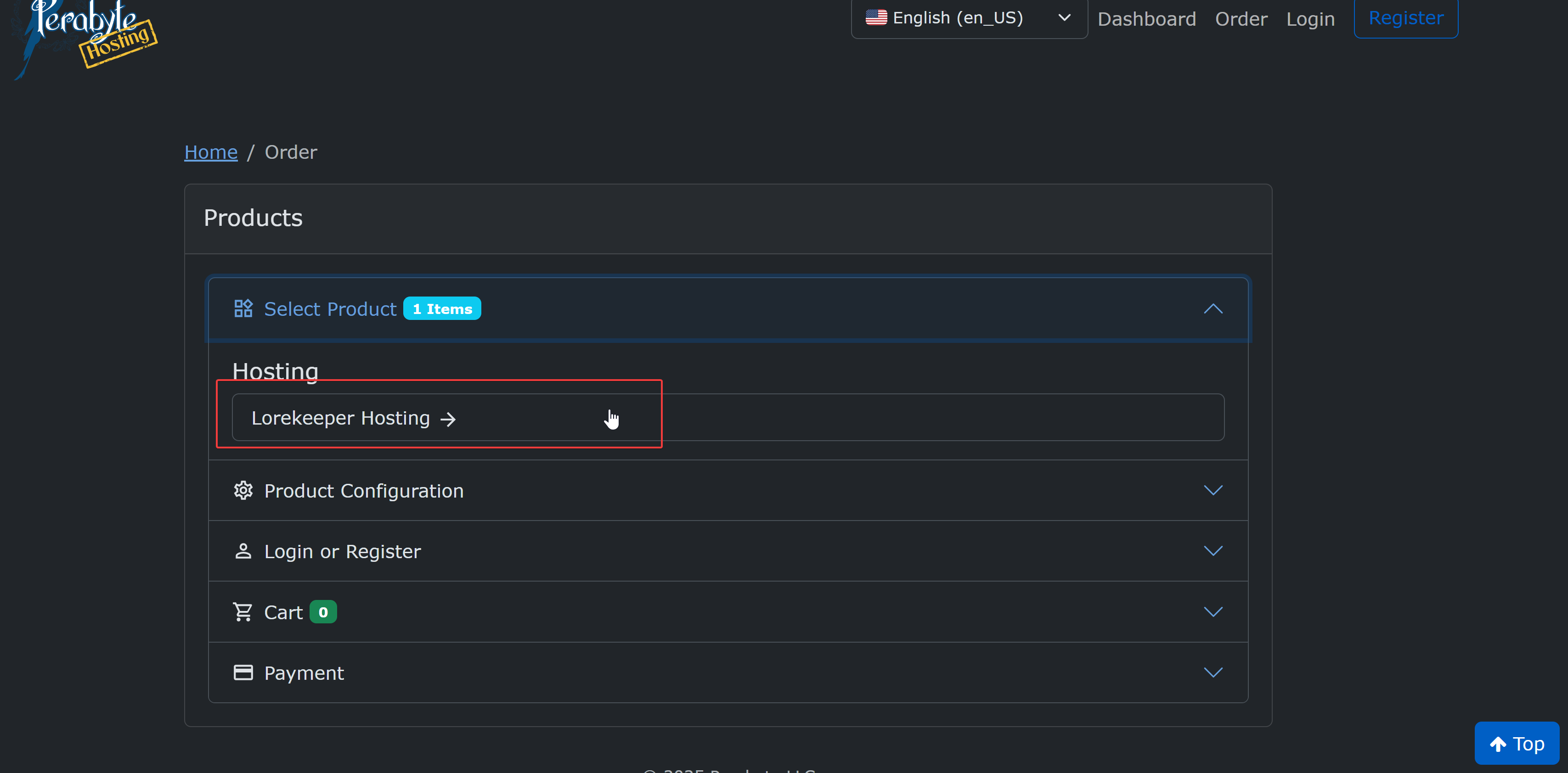 Click "Select Product" and then "Lorekeeper Hosting".