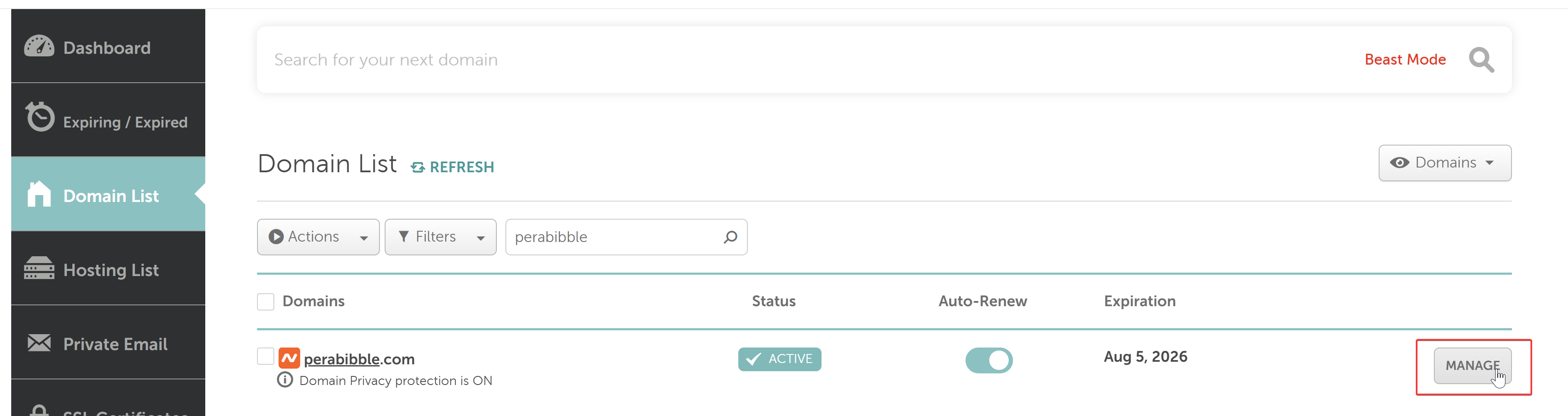 After you create your account, you should update the nameservers on your domain. Log in to Namecheap and click "Manage" next to your domain.