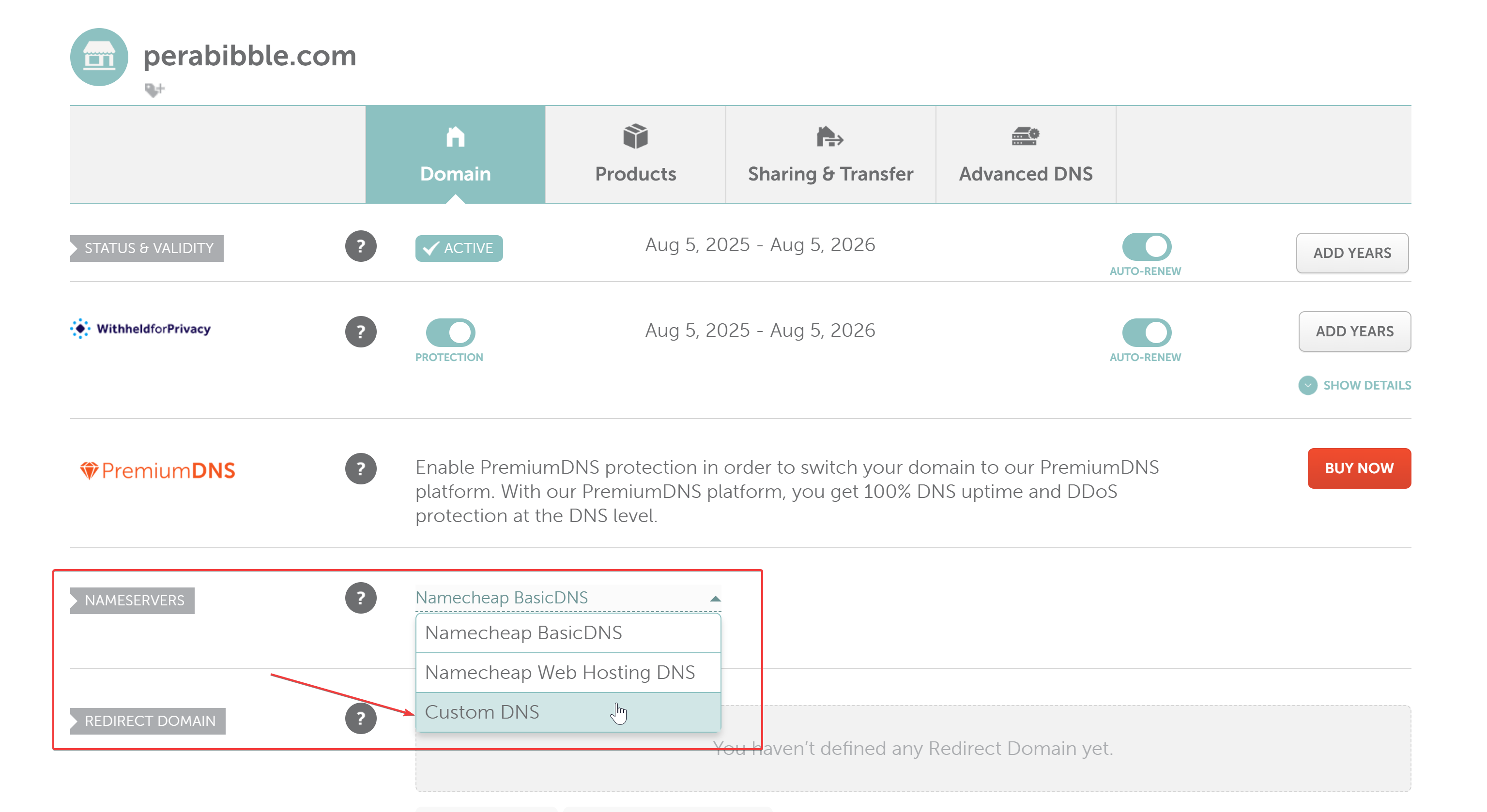 Under "Nameservers", click the dropdown and select "Custom DNS".