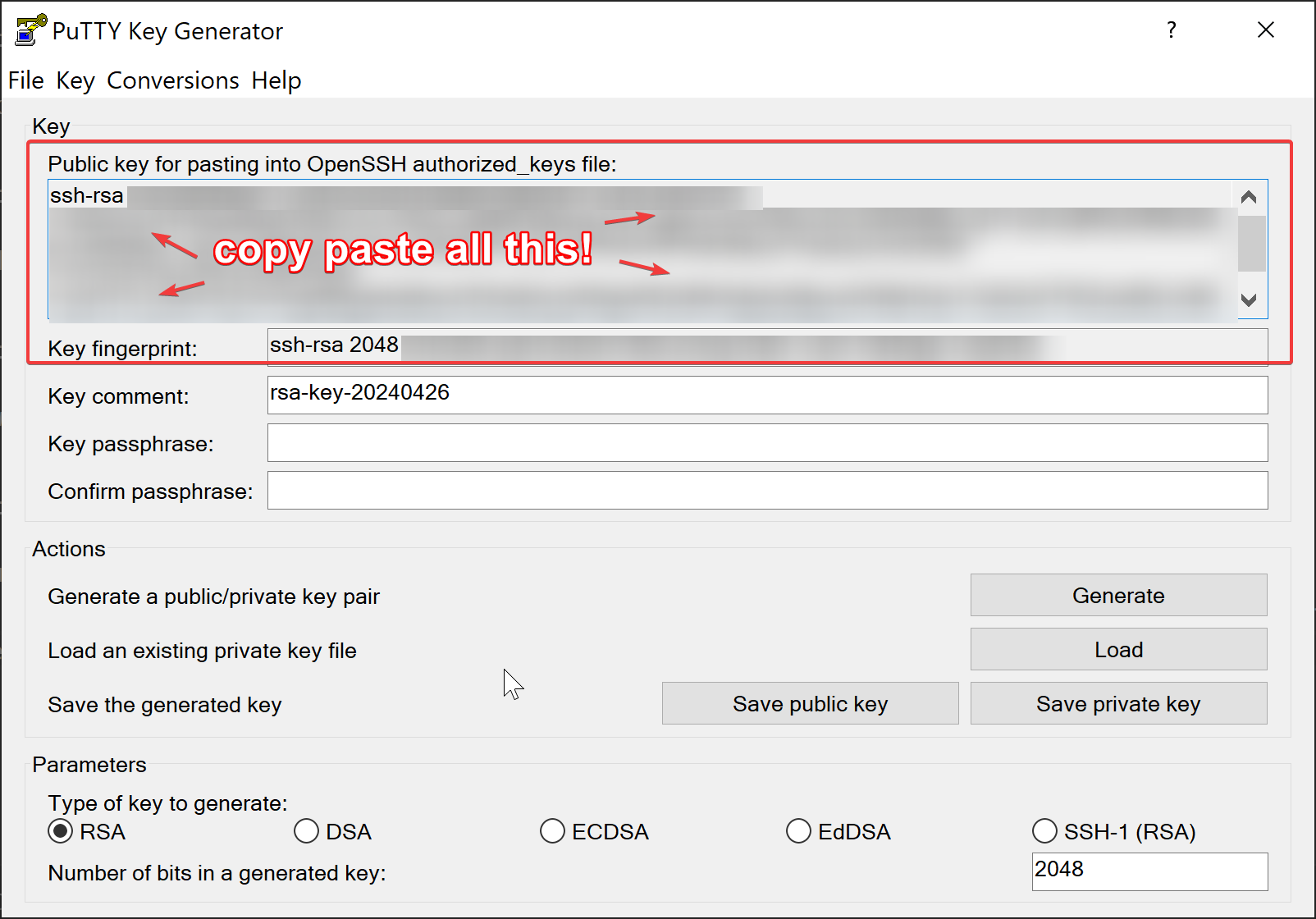On Windows, you can find it by opening PuTTYgen and copying the text found in the "Public key for pasting into OpenSSH authorized_keys file" section.