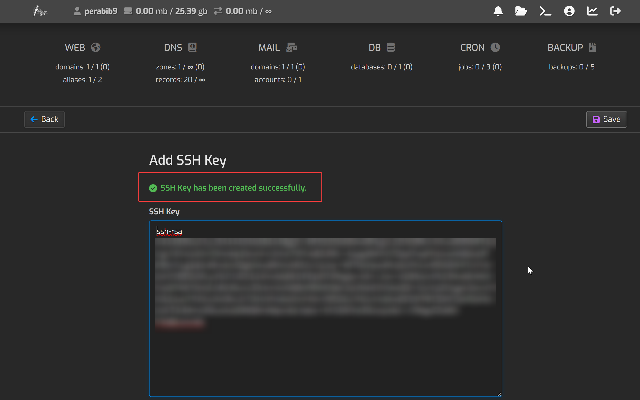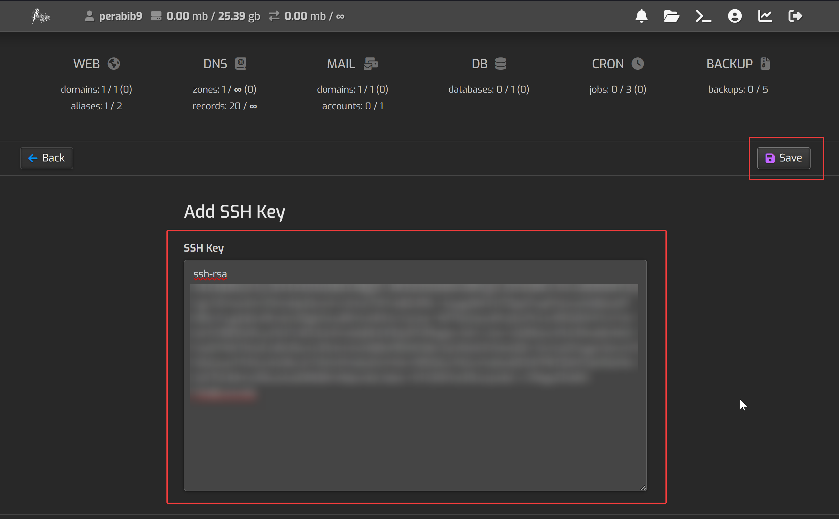 Here you will add your public OpenSSH key and click "Save".