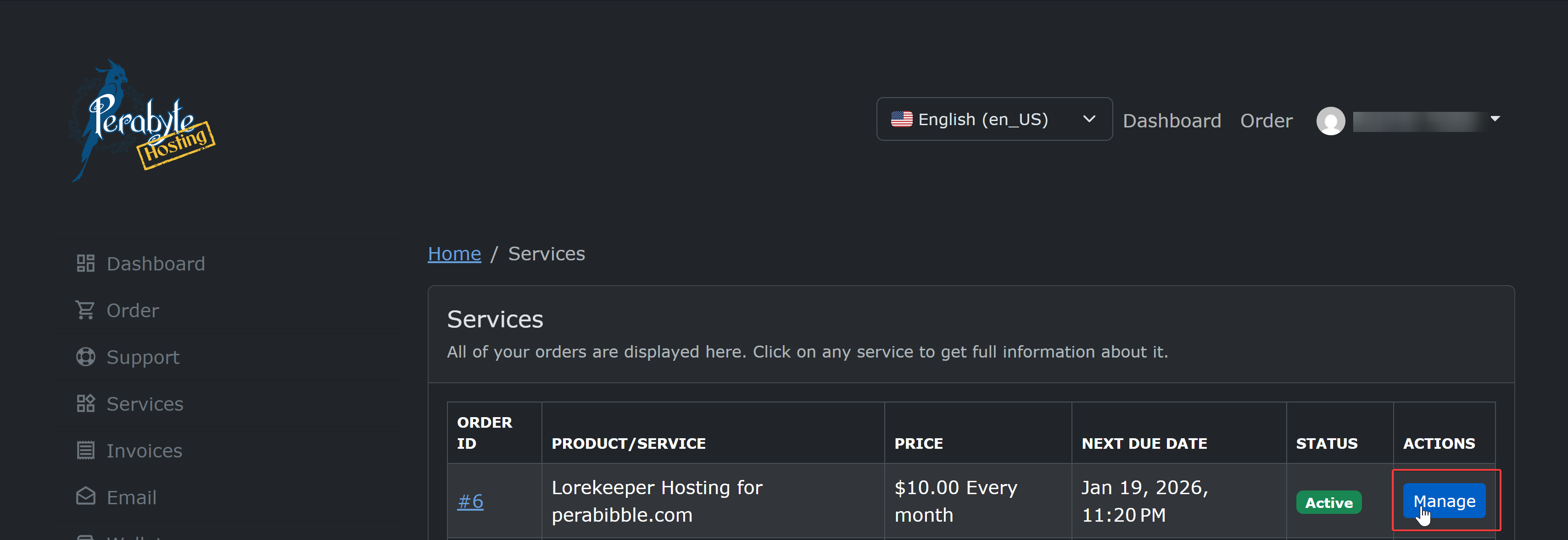 If the email failed to arrive at all, that's OK! Log into billing.perabyte.host and click on "Services" then click "Manage" next to your hosting. Scroll down and you will find a place where you can reset your password, as well as view your assigned username and a link to the control panel.