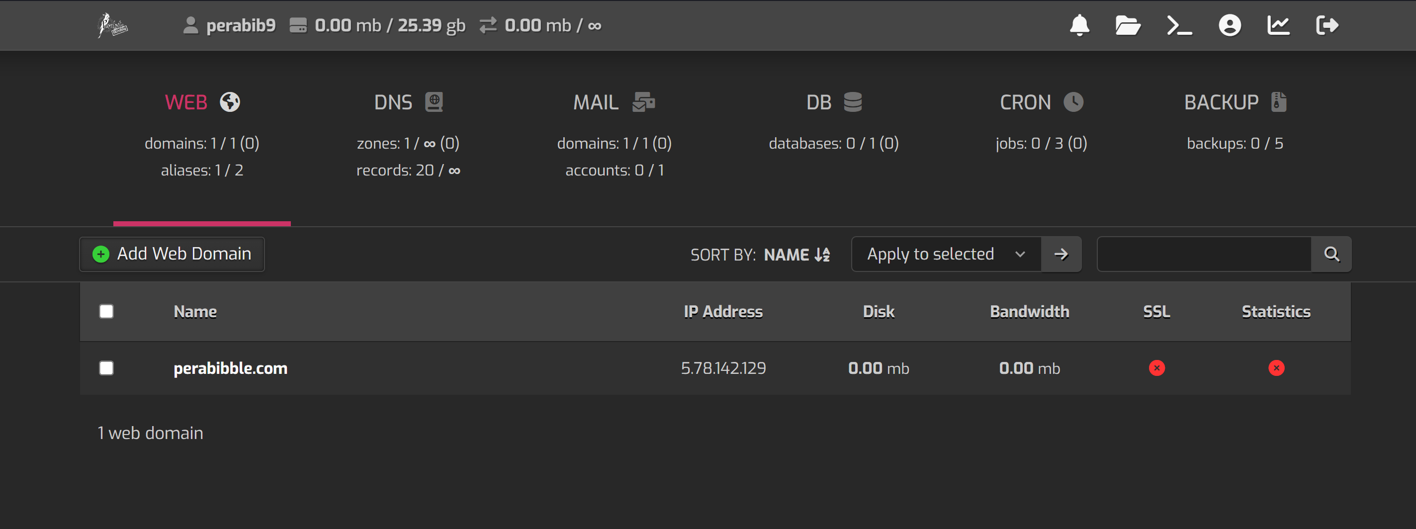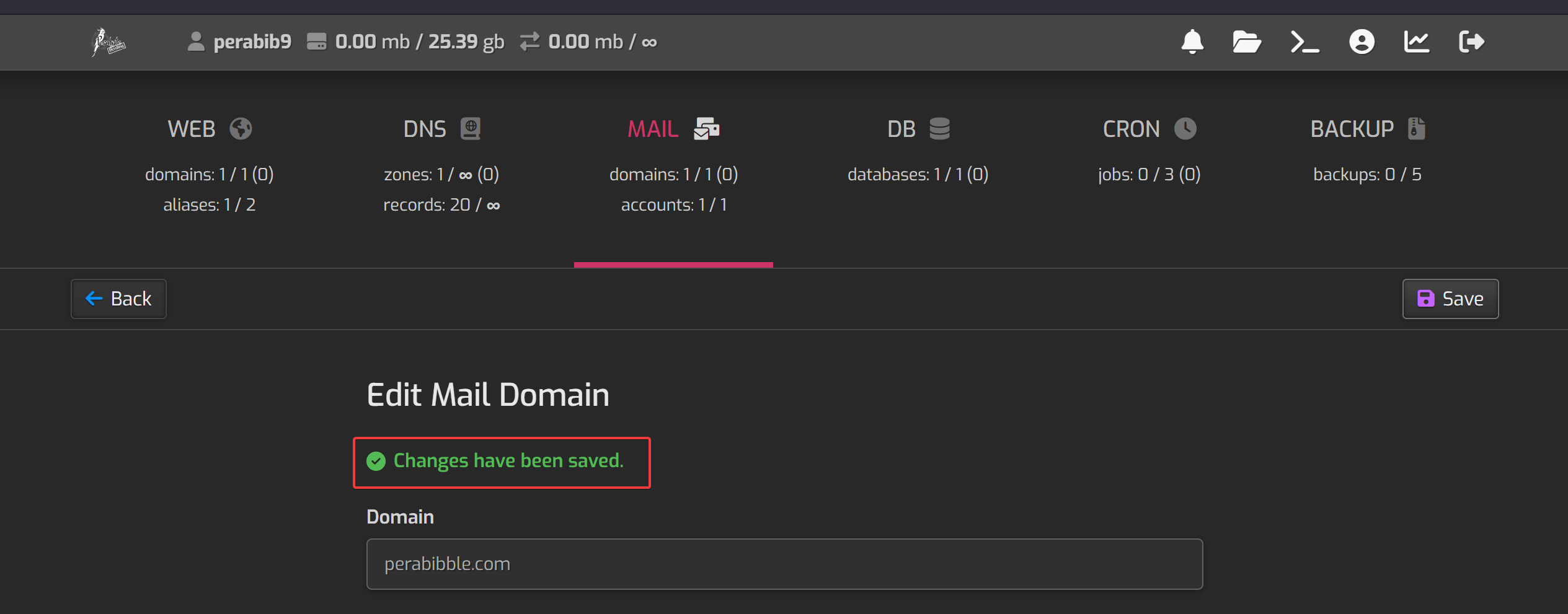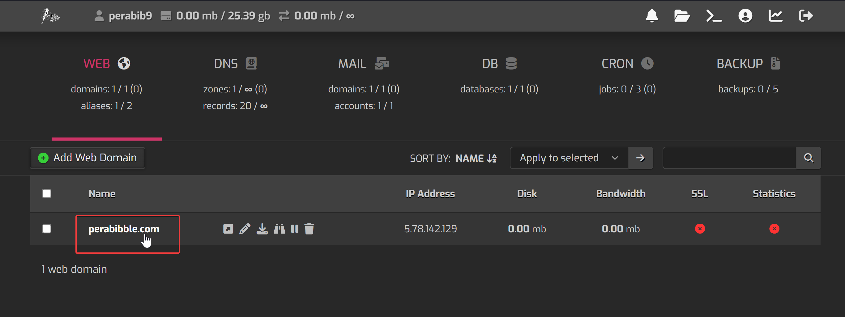 Enter in the two nameserver values ns1.perabyte.host and ns2.perabyte.host. Click the green checkmark to save.
