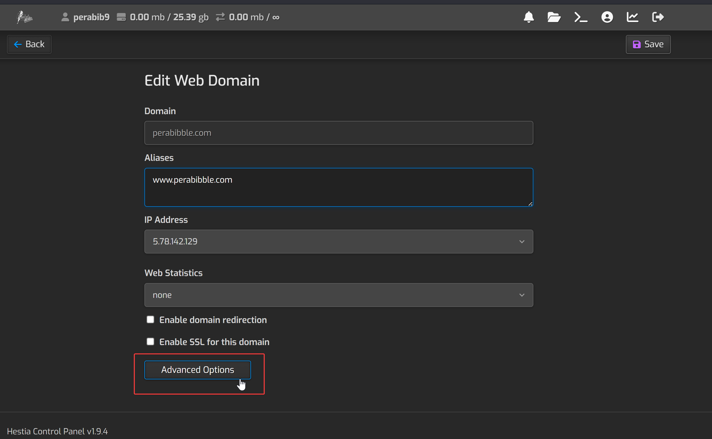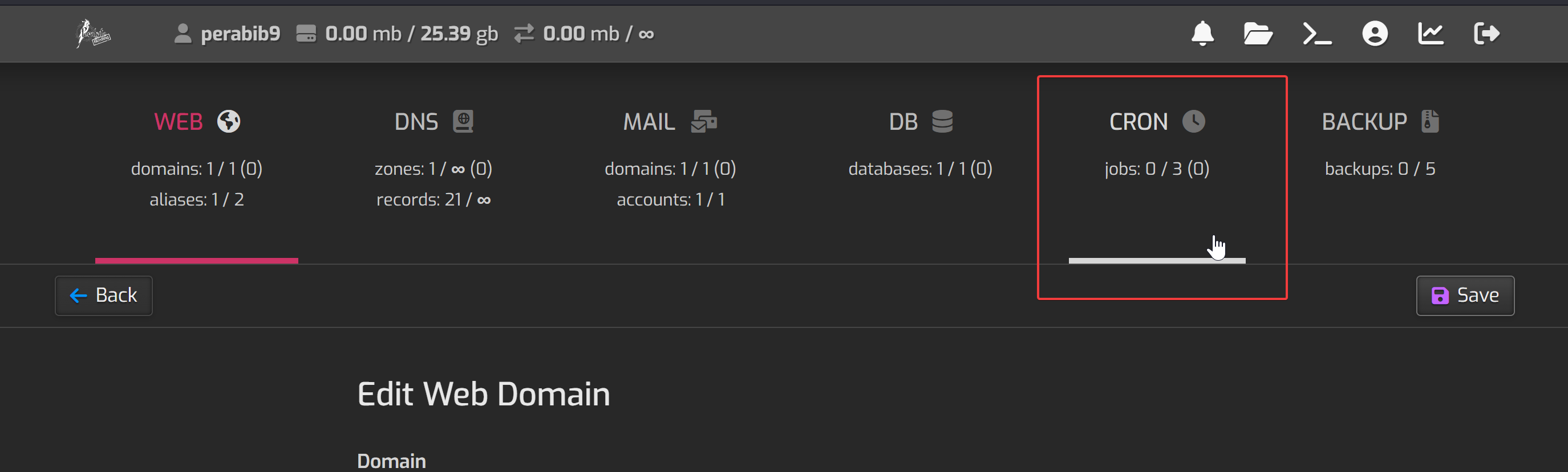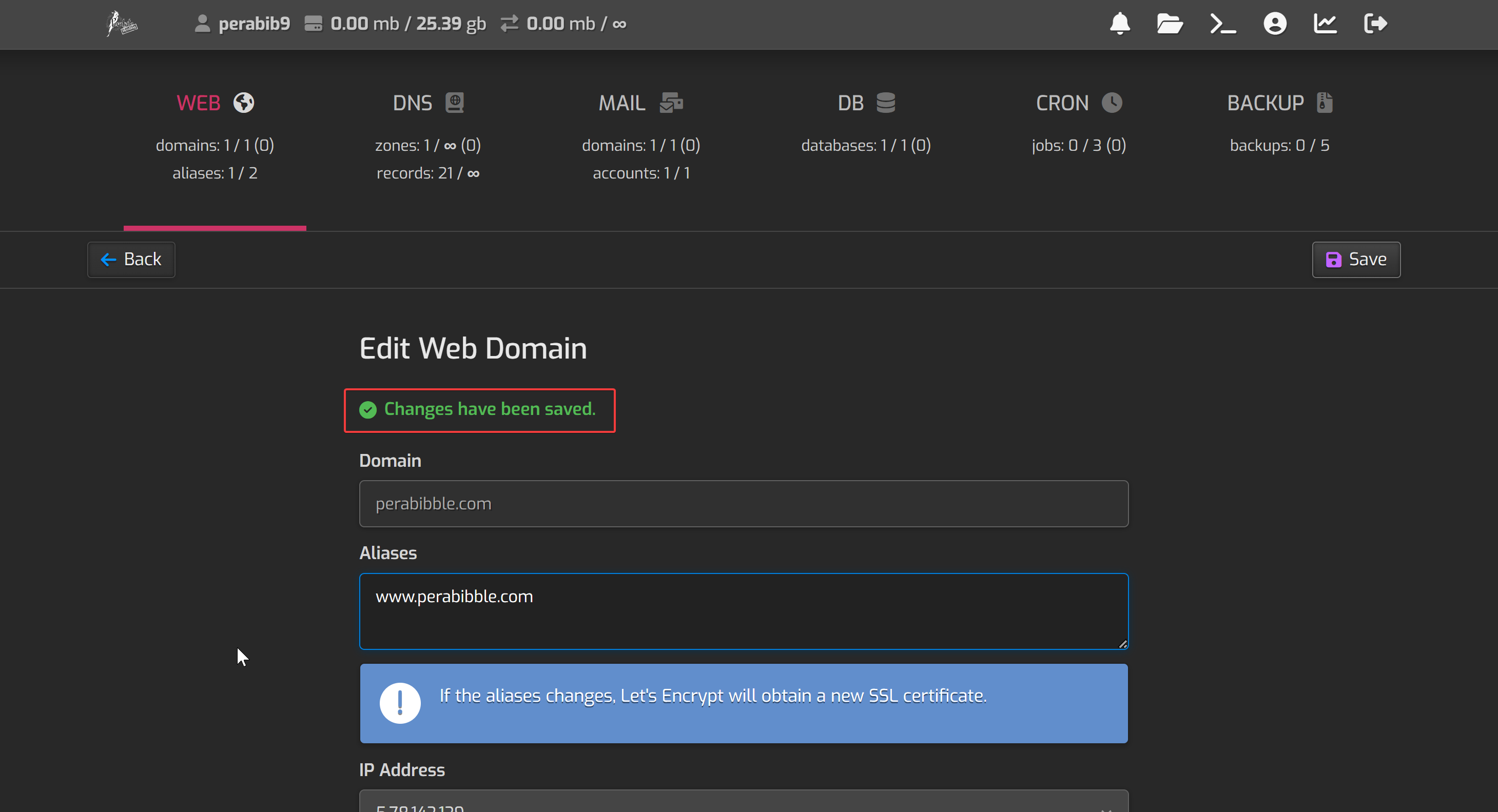 Enter in the two nameserver values ns1.perabyte.host and ns2.perabyte.host. Click the green checkmark to save.