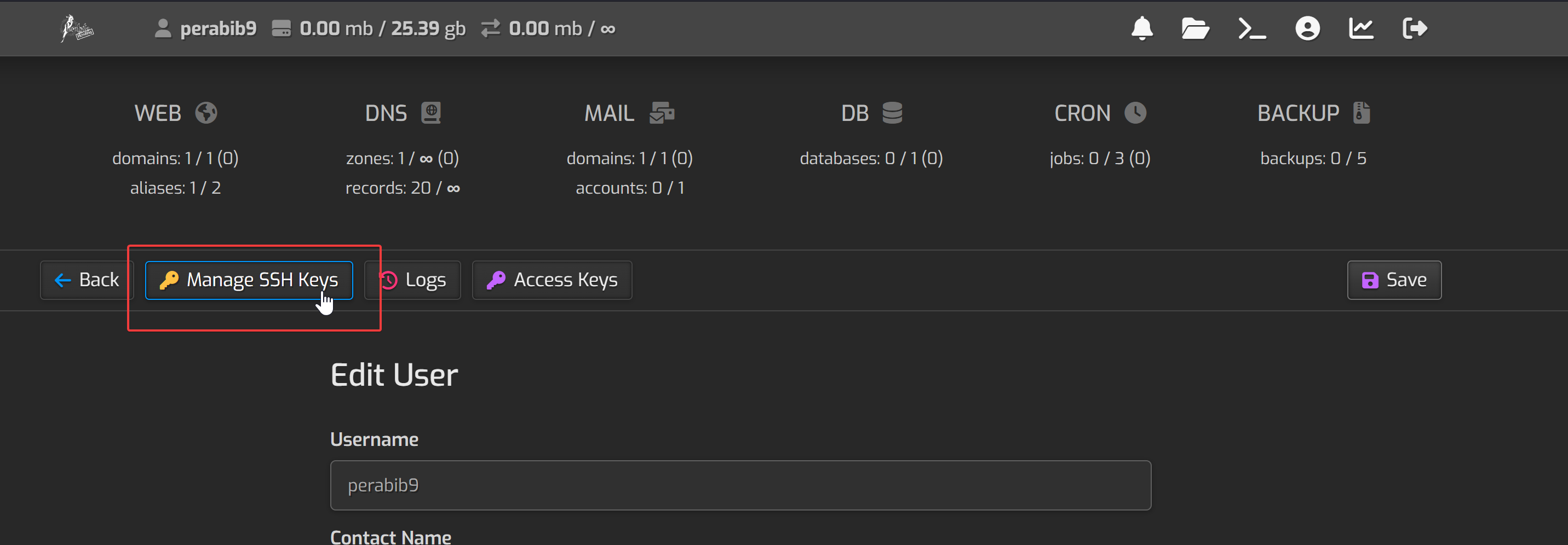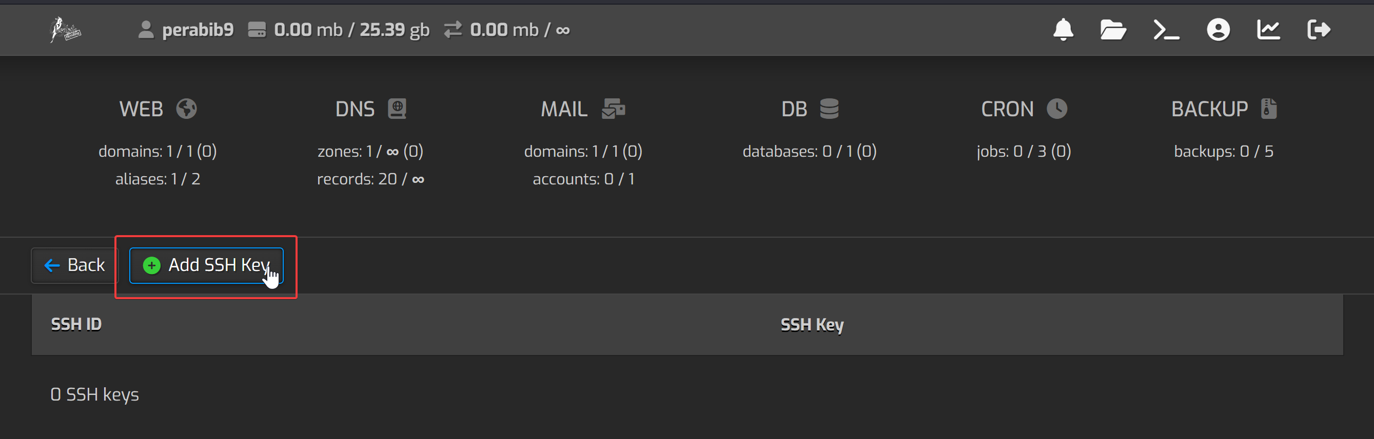 The first thing we are going to do is put in our public SSH key. This will allow us to log into the website via PuTTY or another SSH client. Click the person icon at the top right.
