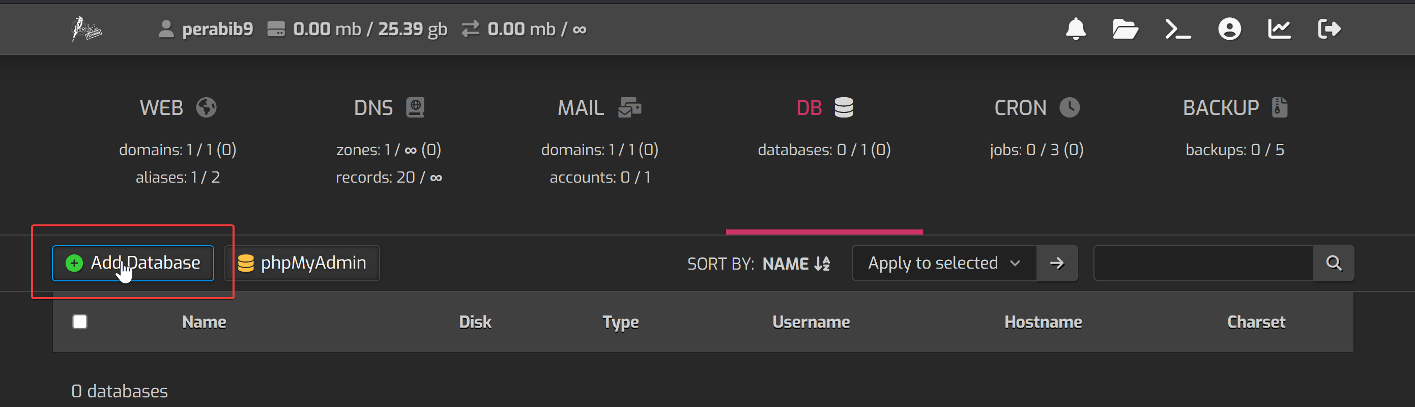 First, let's create the database. This is where all of the data for your site will be stored. From where you are, click the big "DB" button in the navigation.