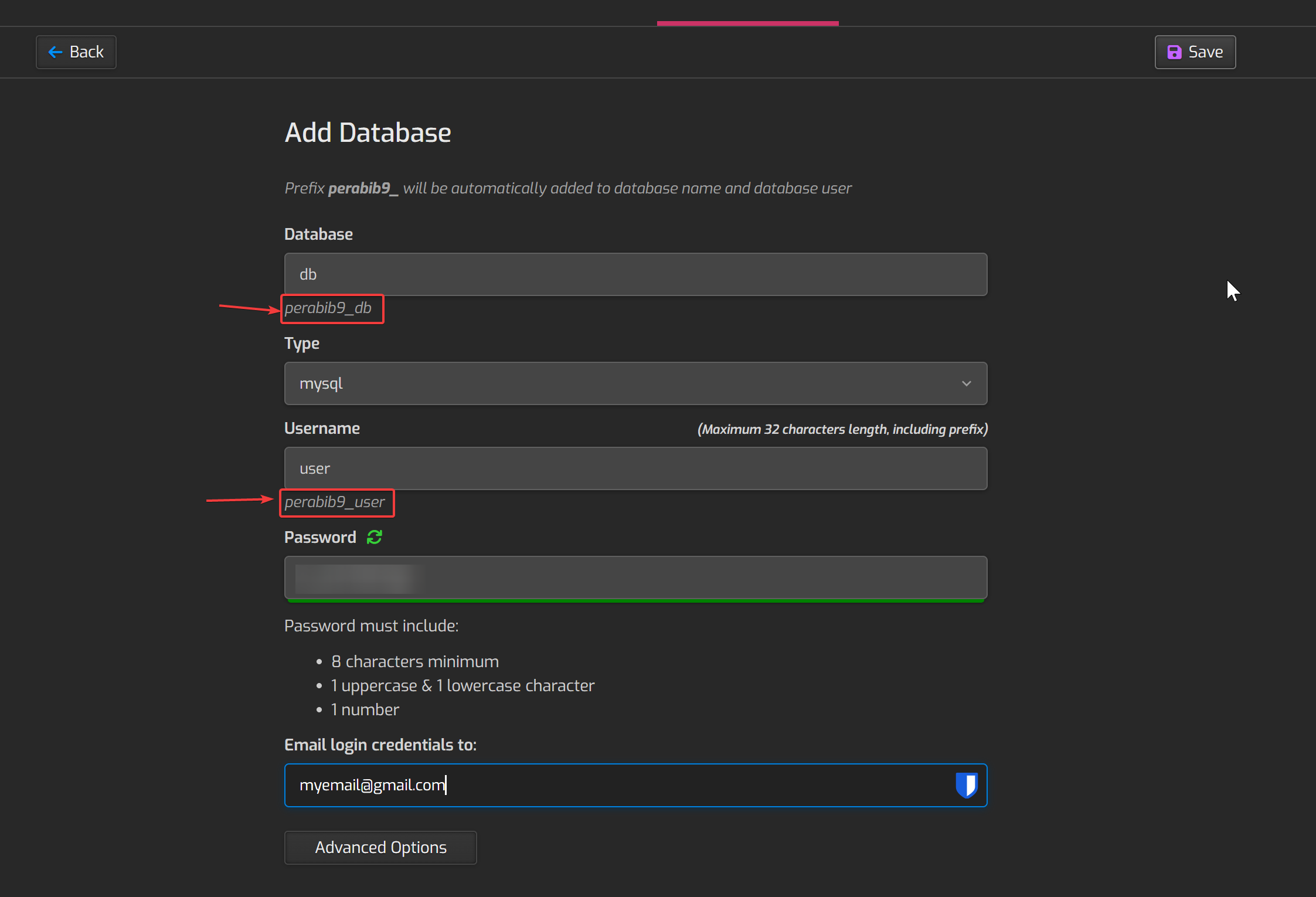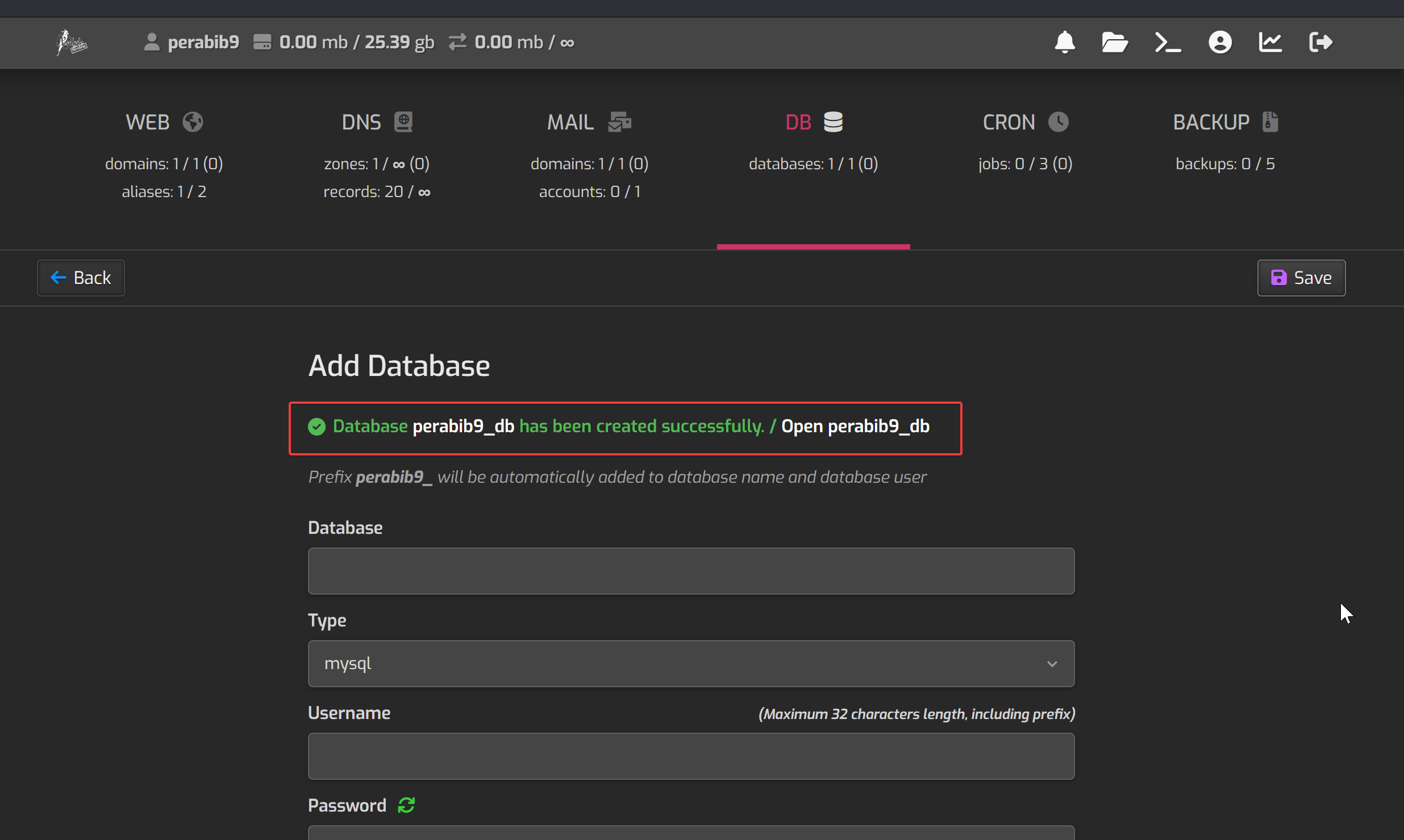 I have entered db and user as the name and username, which means the actual database name is perabib9_db and a username of perabib9_user. These highlighted values in the picture below are the ones you want to save.
