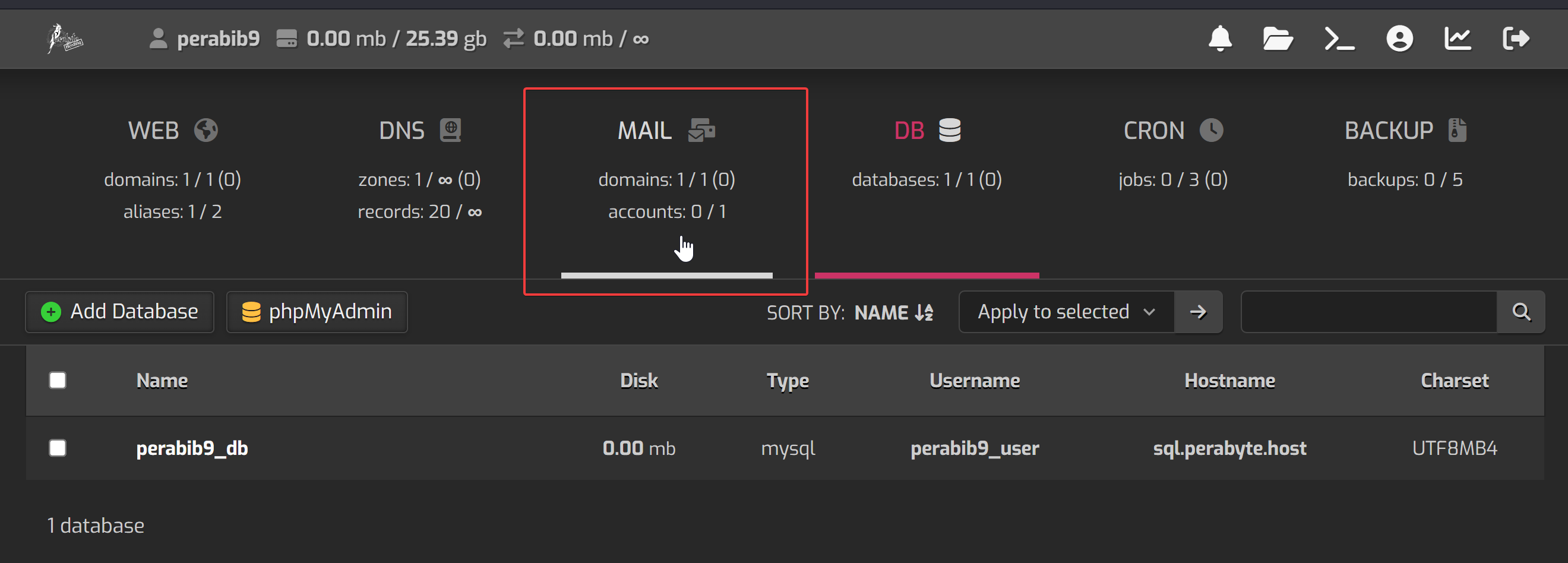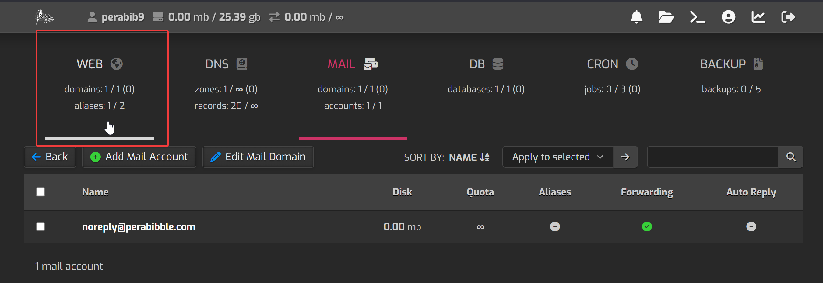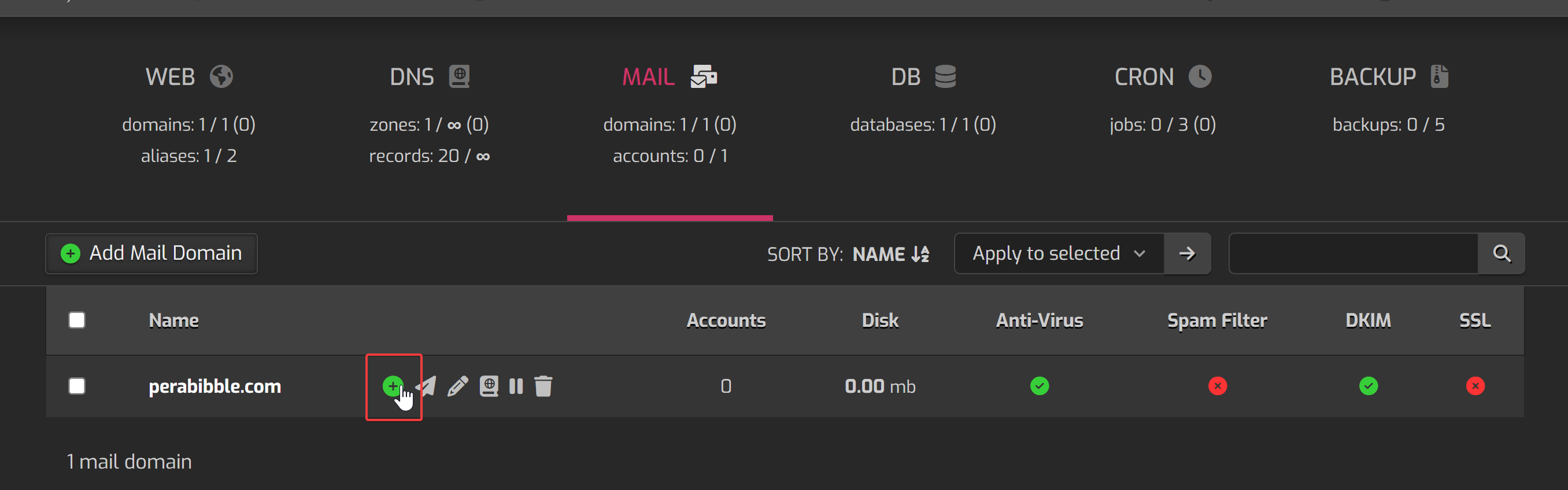 You will already see a mail domain created for you. Hover over it, and select the small + icon to "Add Mail Account".