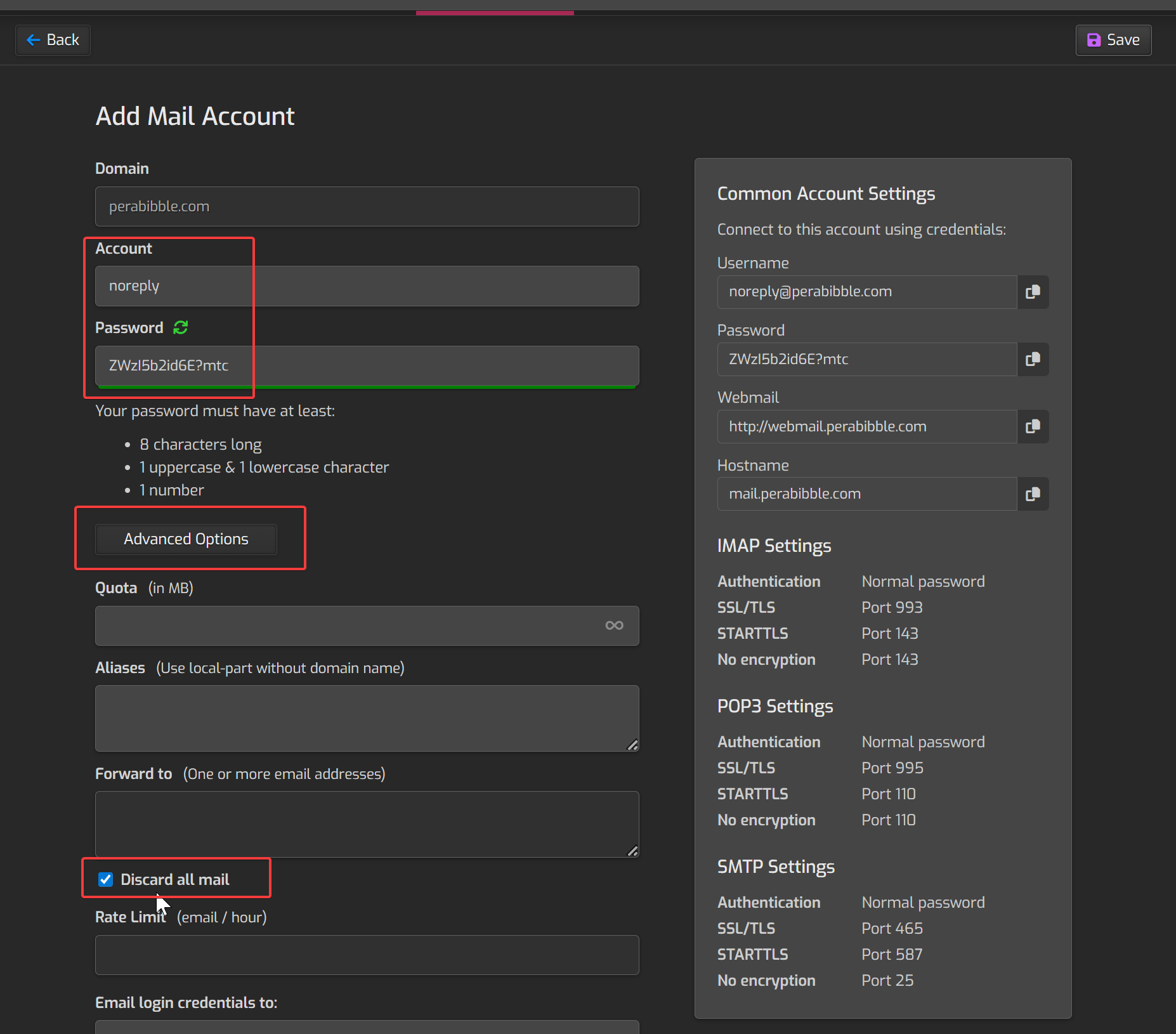 Before we click save, we are going to check the advanced options. Check "Discard all mail". Leave everything else as-is.