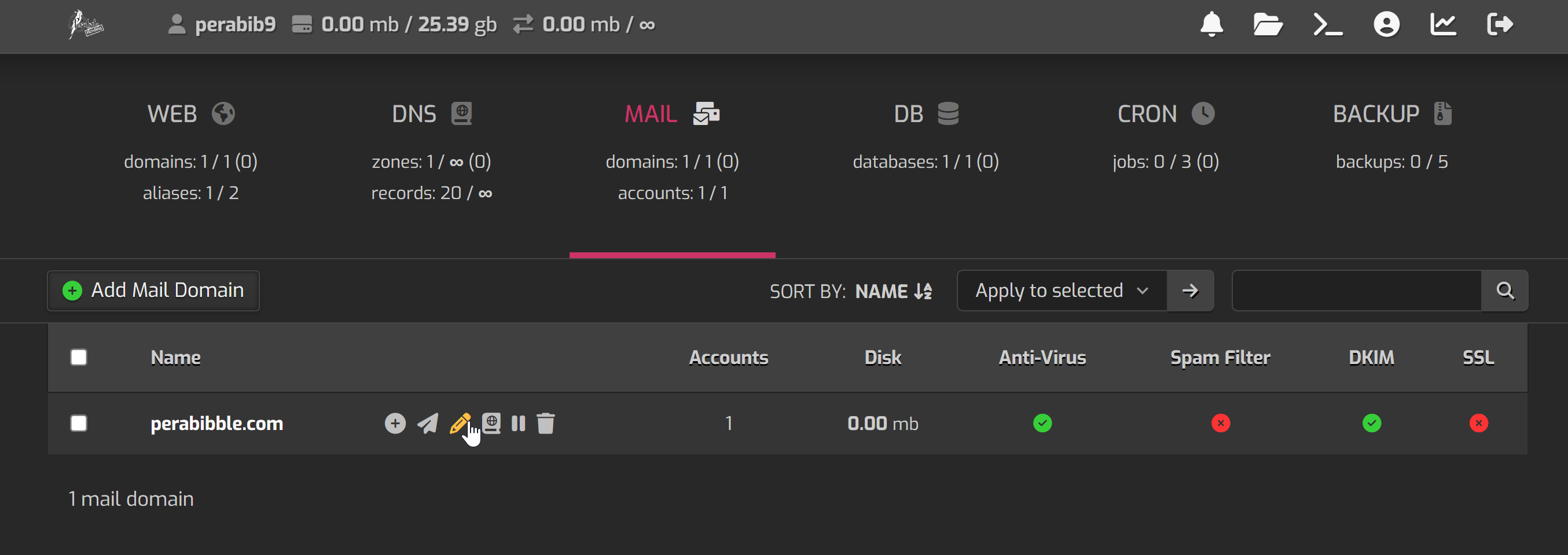 Click the "Mail" button in the navigation again. We are going to enable a setting on our mail domain to make it safer and more secure. This time, hover over the domain name and select the pencil icon to edit it: