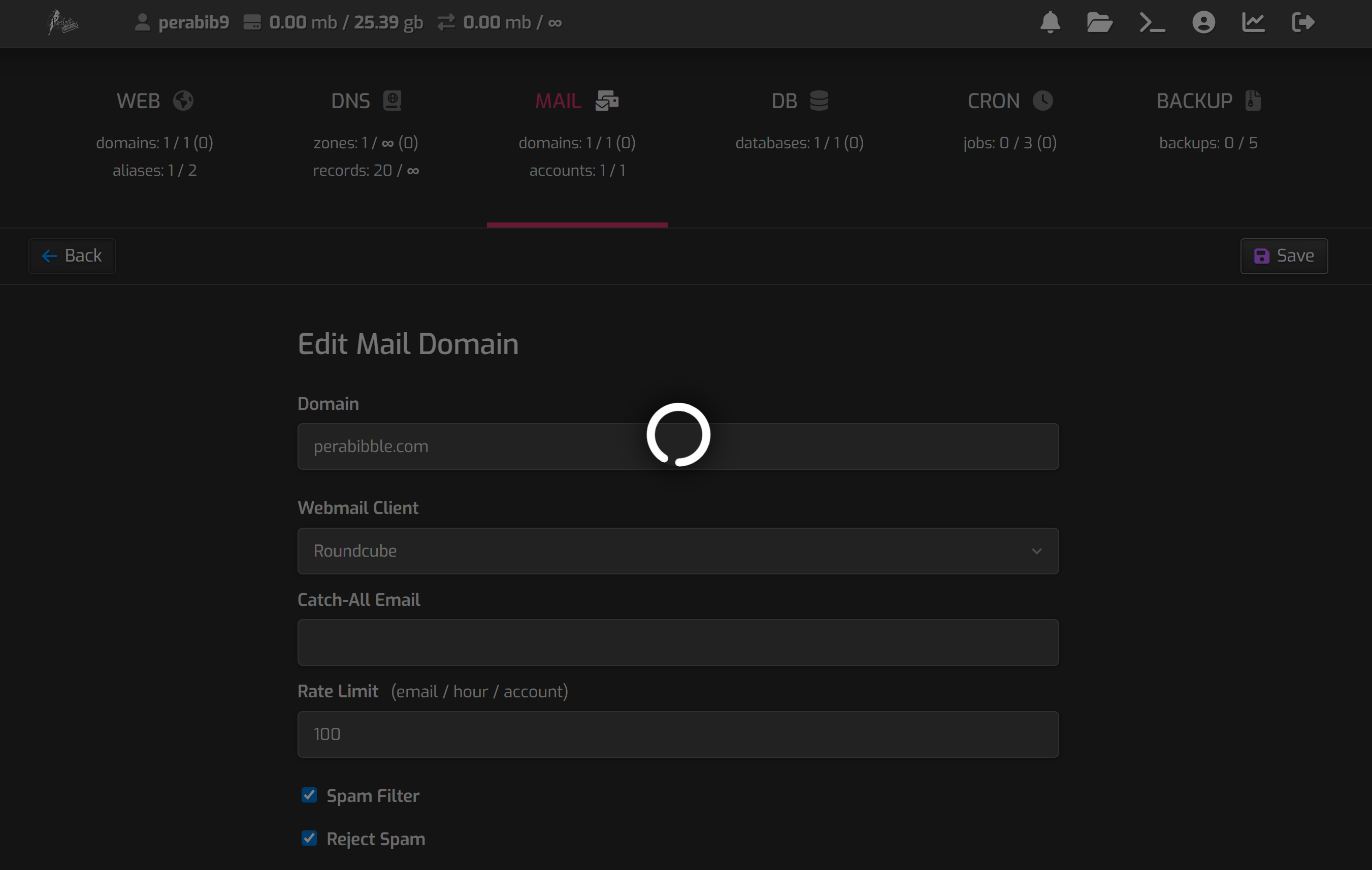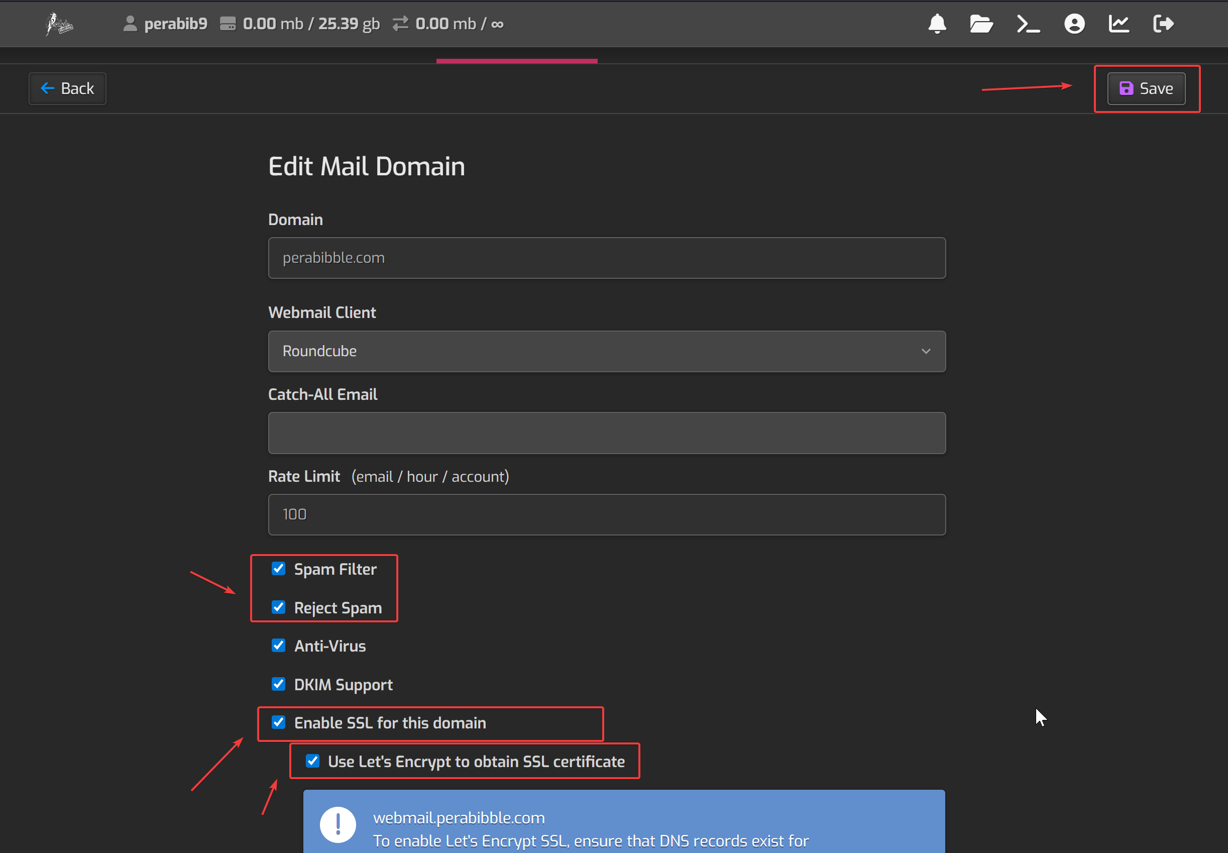 Check the boxes "Spam Filter", "Reject Spam", and "Enable SSL for this domain". Then check "Use Let's Encrypt to obtain SSL certificate". Click save. This may take some time to load as it fetches the SSL certificate. Be patient and do not close the page!