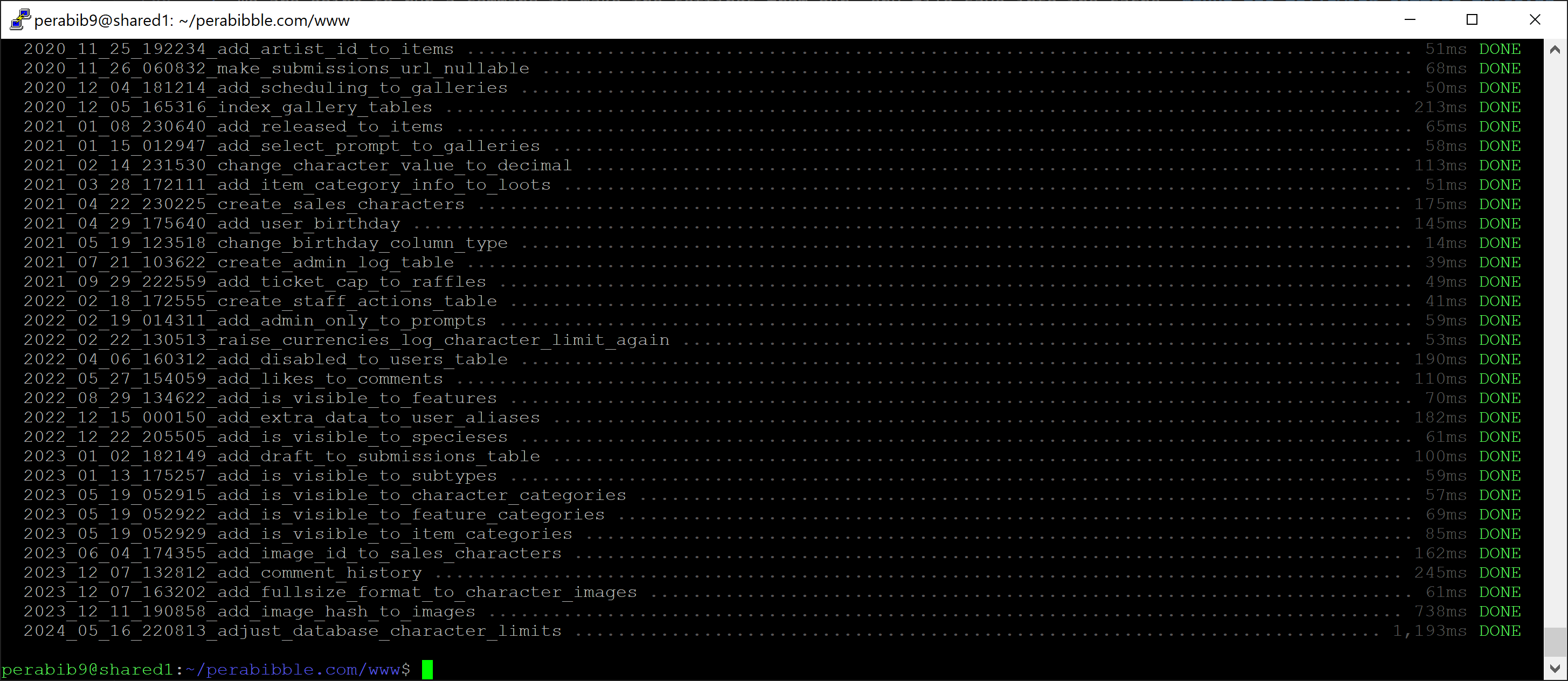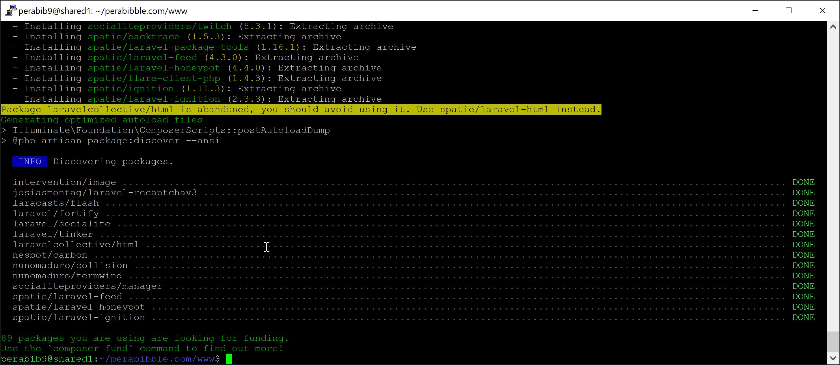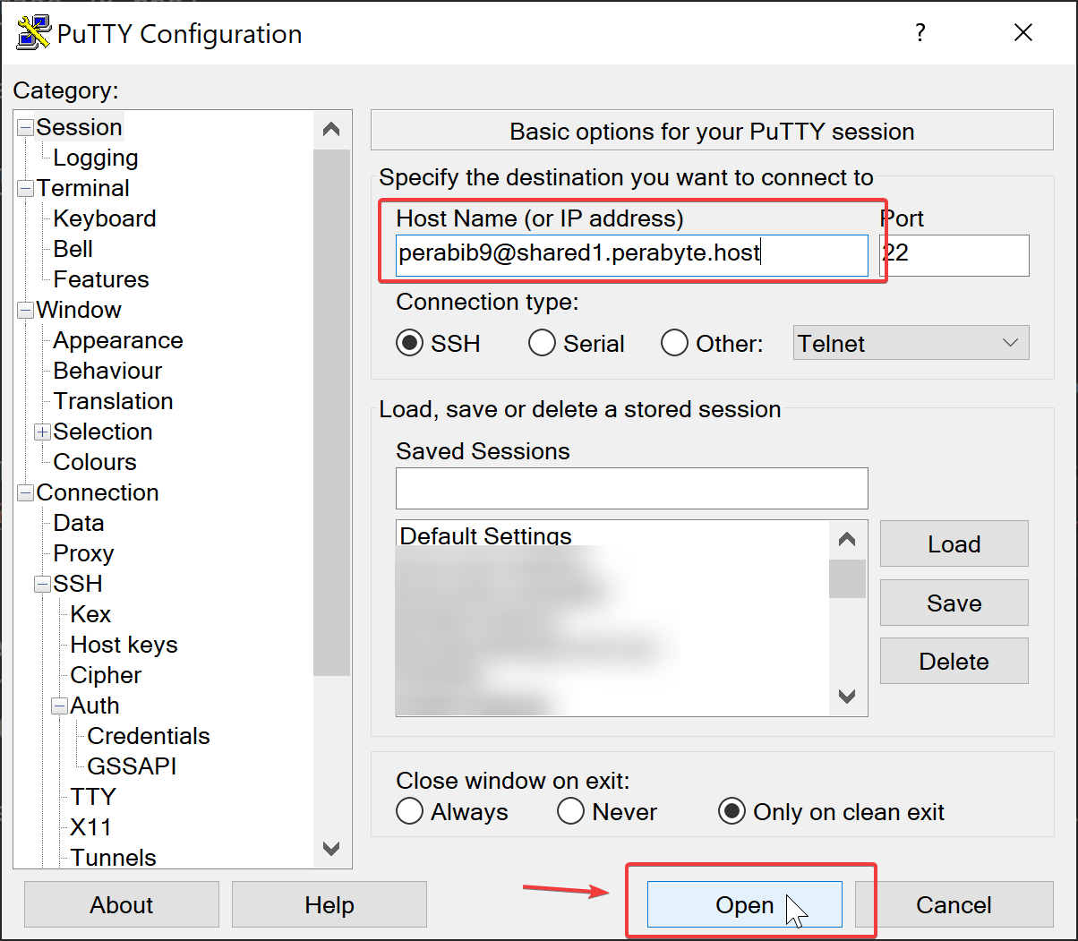 Open up PuTTY or your other favorite SSH tool. Load in your SSH key and connect to your server via YOURUSERNAME@YOURSERVERURL. For example, I am using PuTTY and my connection is perabib9@shared1.perabyte.host.