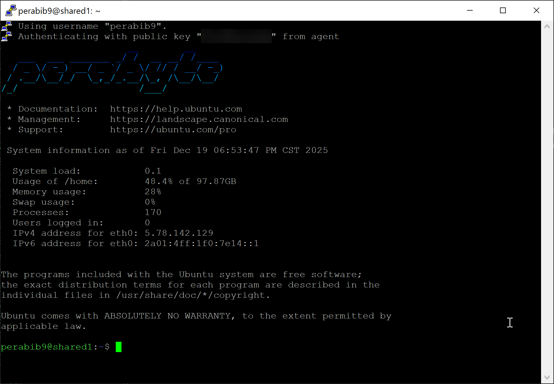 If your SSH key is properly configured, you should have logged in automatically. You will see a screen like this: