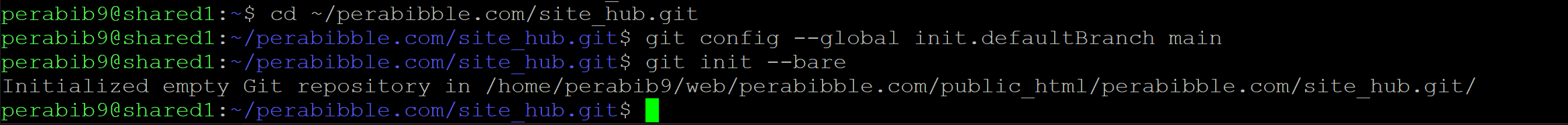 Let's set up the site_hub.git folder first. We will set our default branch to be called "main", and then create a "bare" git repository in the site_hub.git folder: