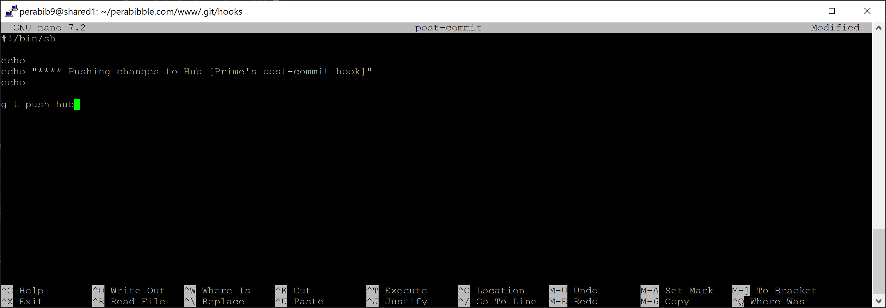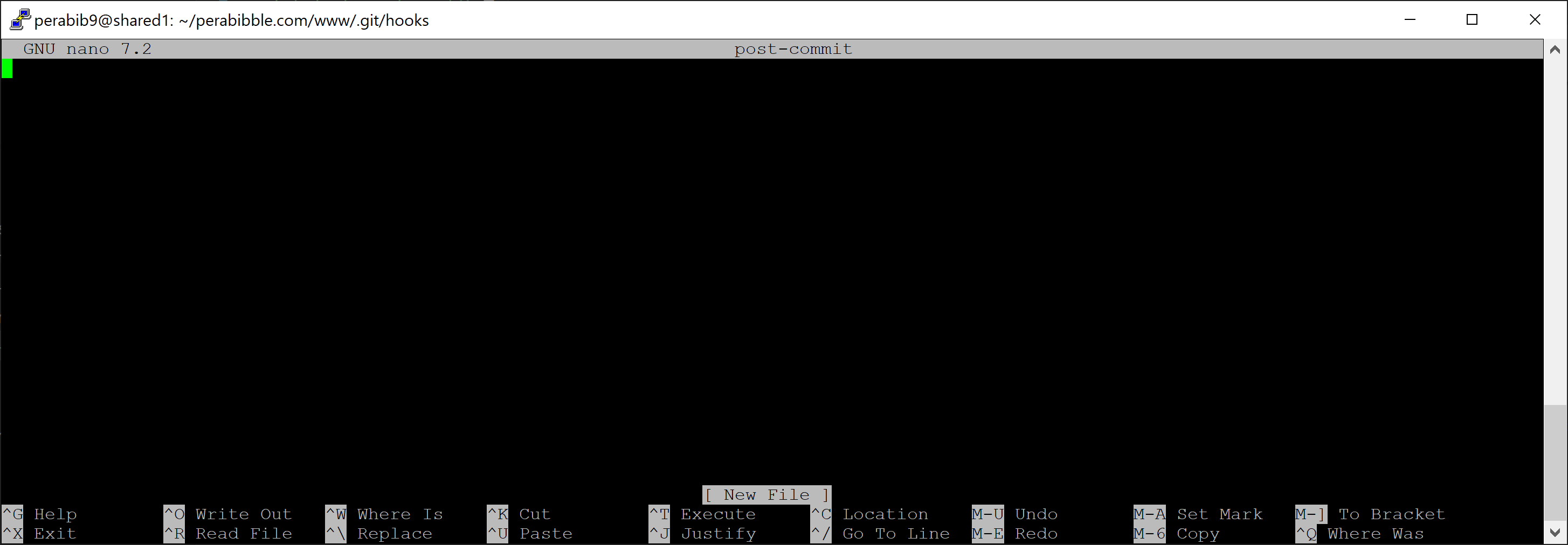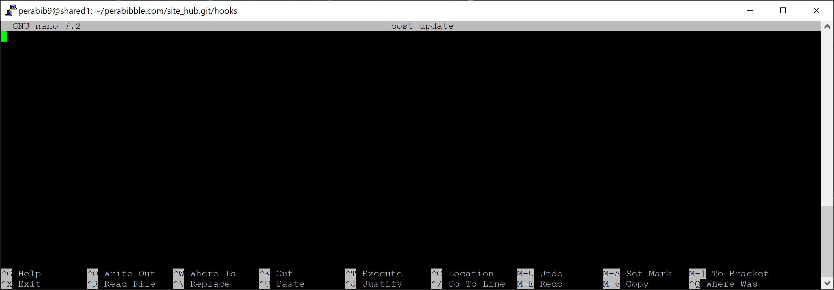 nano post-update will open up a command line text editor tool called nano, to create a new file named post-update. It should look like this when you run the command: