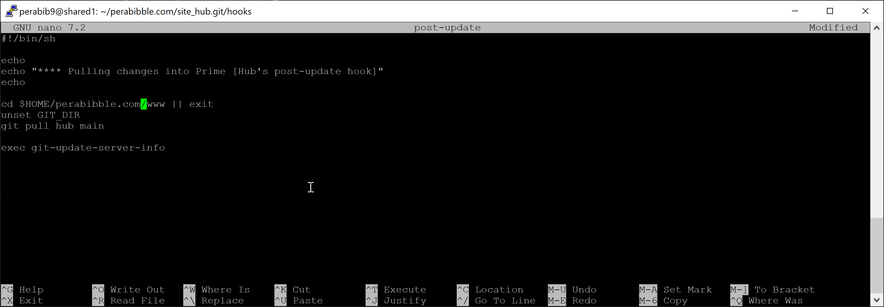 #!/bin/shechoecho"**** Pulling changes into Prime [Hub's post-update hook]"echocd$HOME/YOURDOMAIN.COM/www ||exitunset GIT_DIR