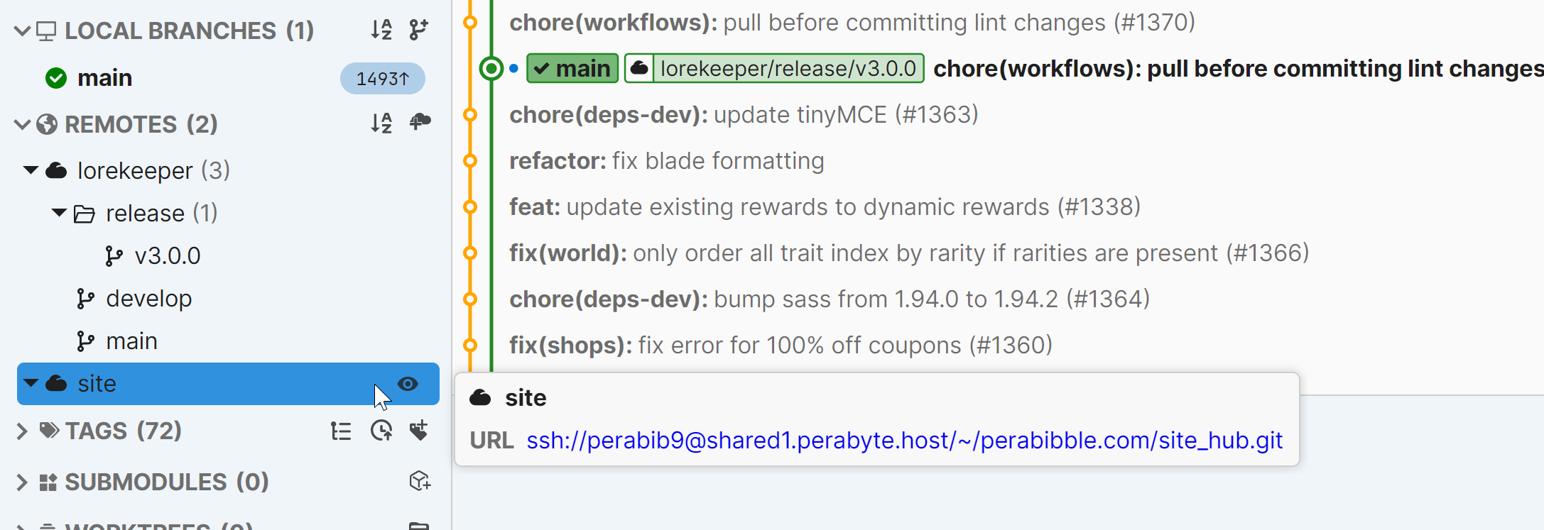 Repository URL: ssh://USERNAME@SERVERURL/~/YOURDOMAIN.COM/site_hub.git. For example, mine is ssh://perabib9@shared1.perabyte.host/~/perabibble.com/site_hub.git