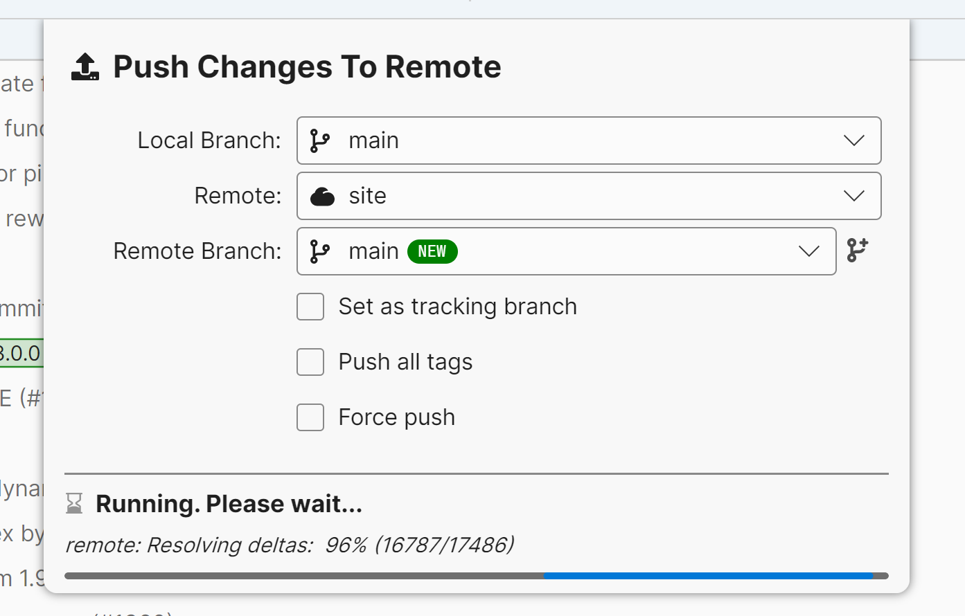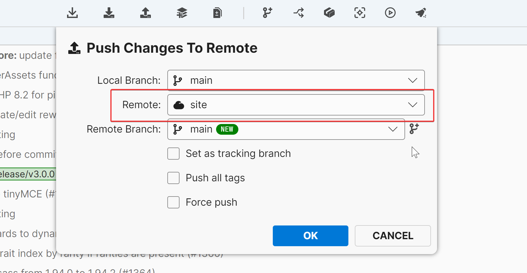 Change the "Remote" from whatever it was previously to site. "Local branch" and "remote branch" should both be selected as main. For example: