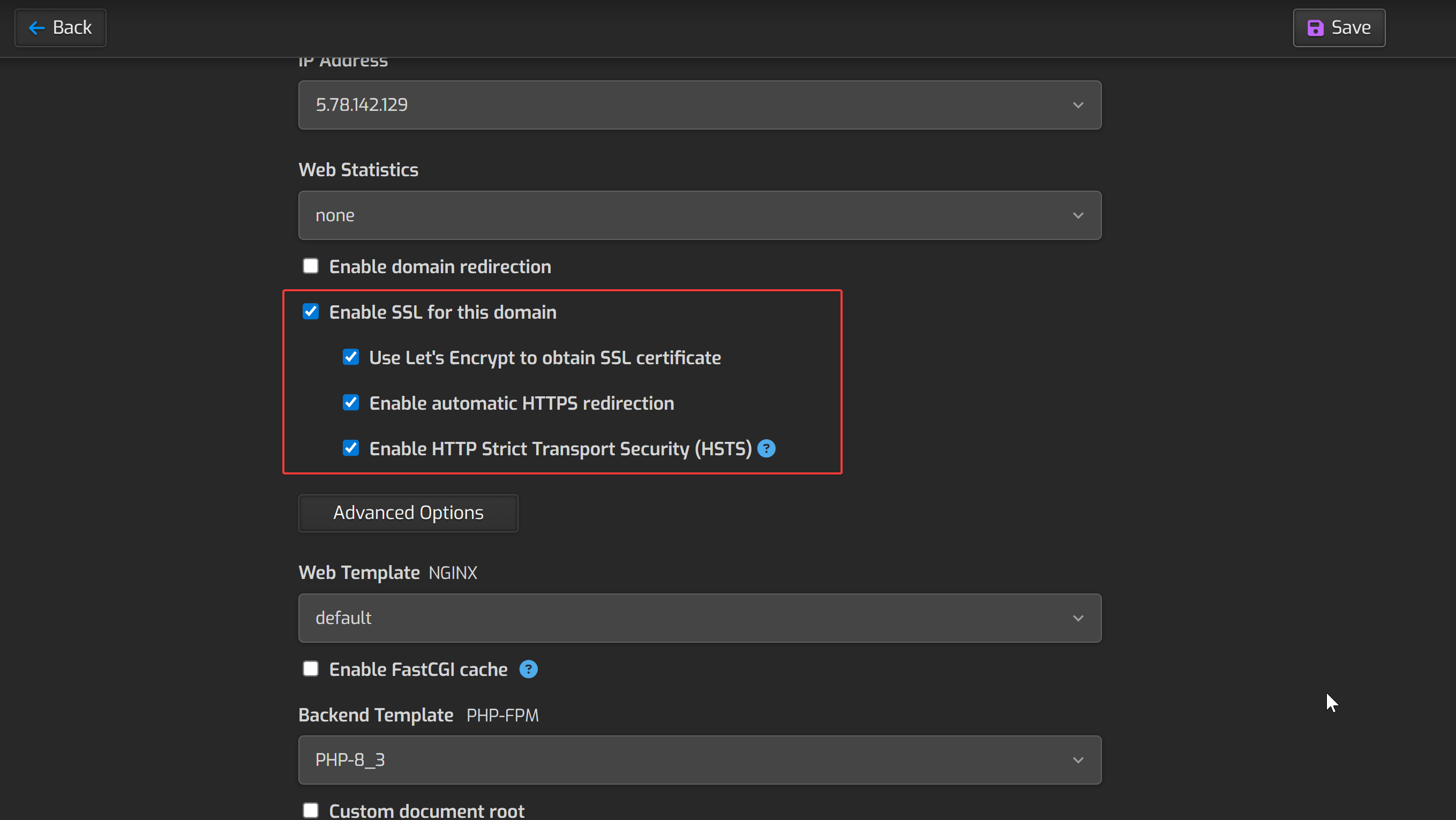 We are going to select several things here. Check the box for "Enable SSL for this domain" and check all the boxes under it -- "Use Let's Encrypt to obtain SSL certificate", "Enable automatic HTTPS redirection", and "Enable HTTP Strict Transport Security (HSTS)".