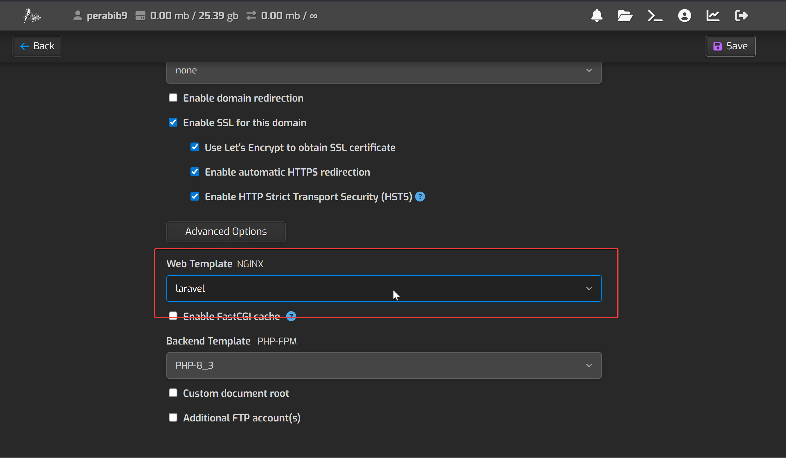 Next, click the dropdown for "Web Template". There are a LOT of options, but we only care about one -- select laravel.
