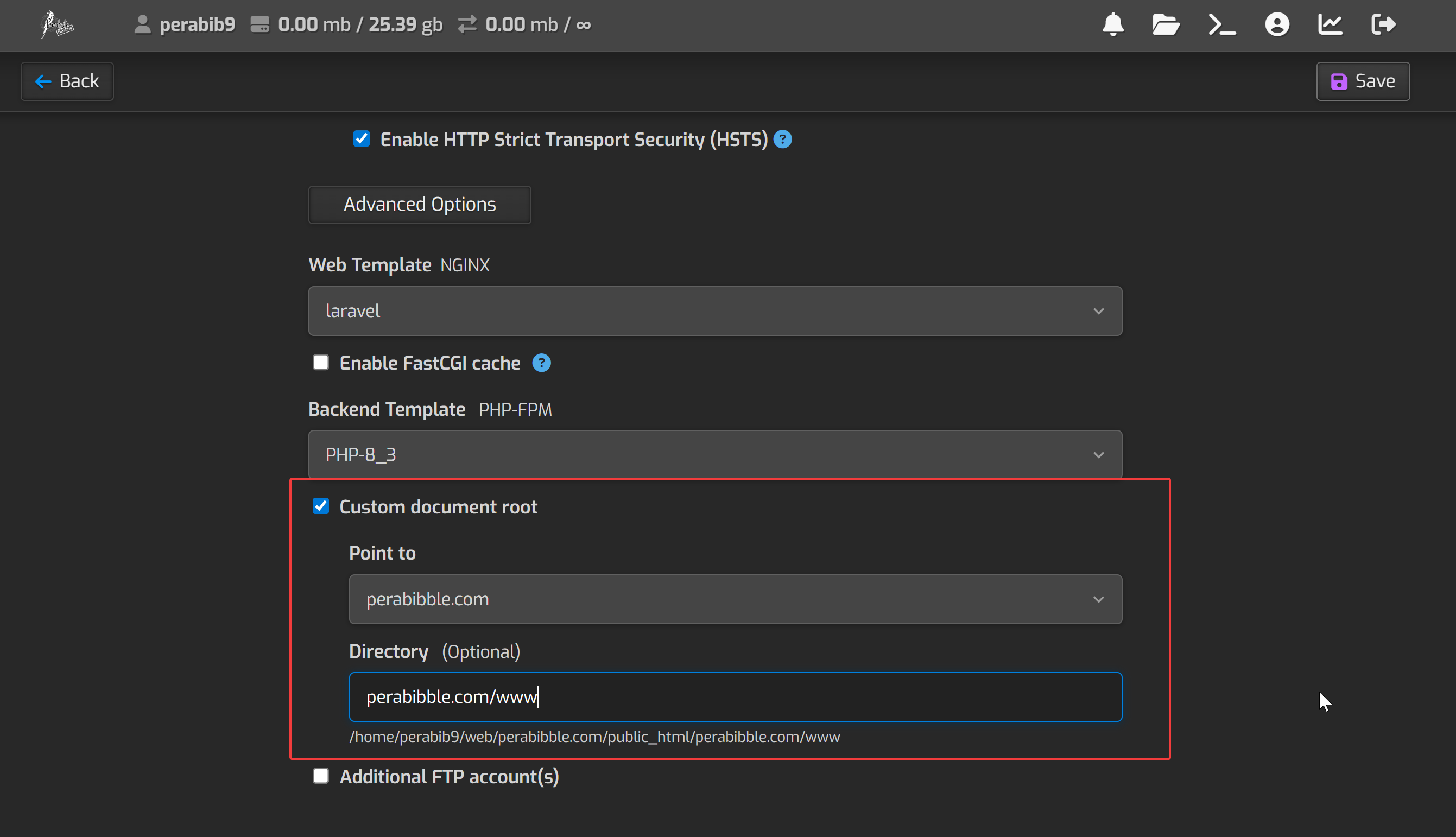 Next, check "Custom document root" and in directory type SITENAME.COM/www. For example: