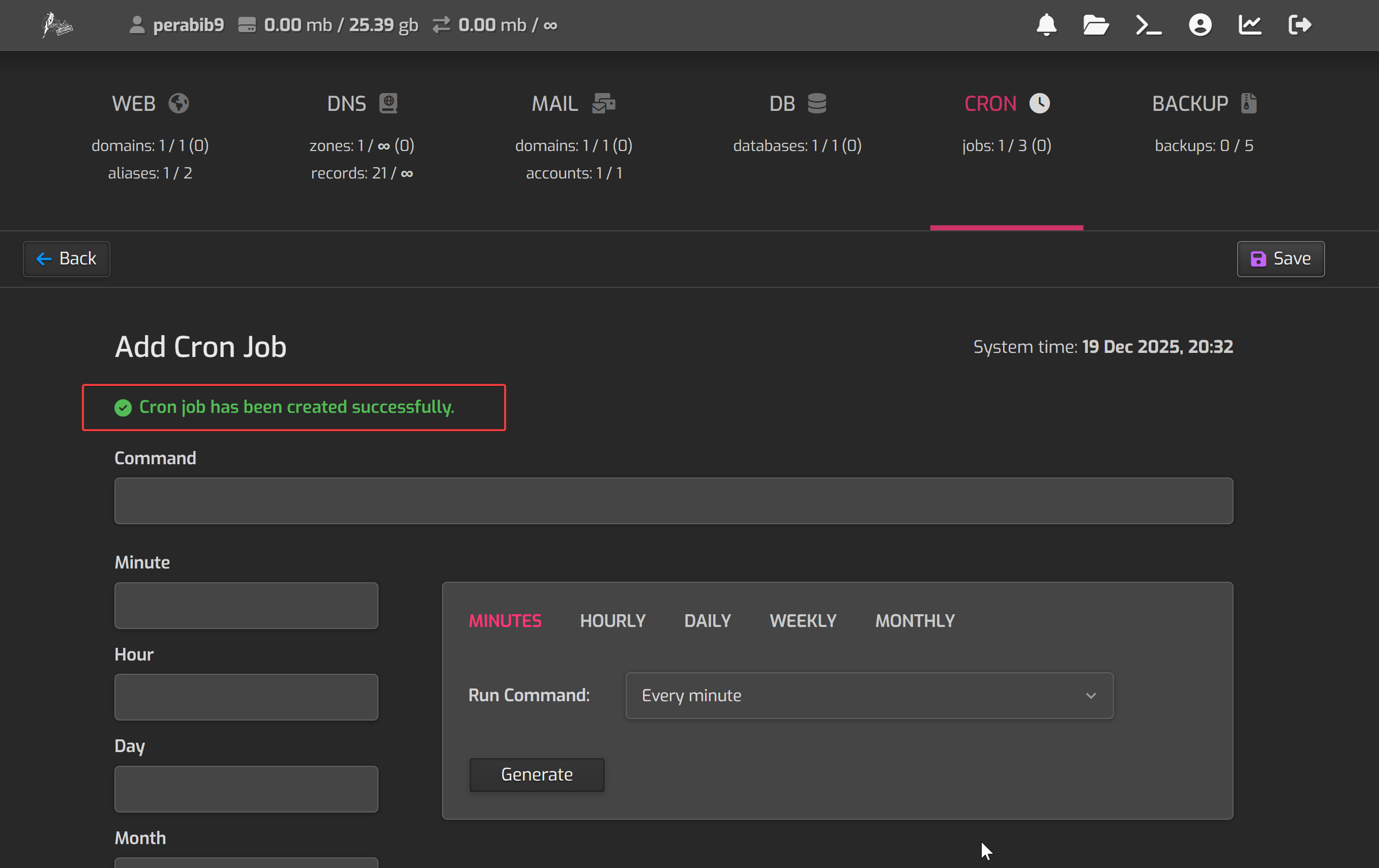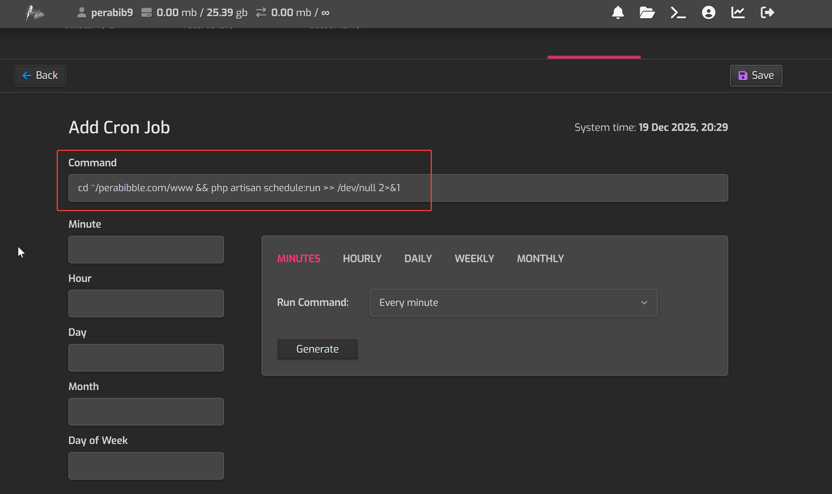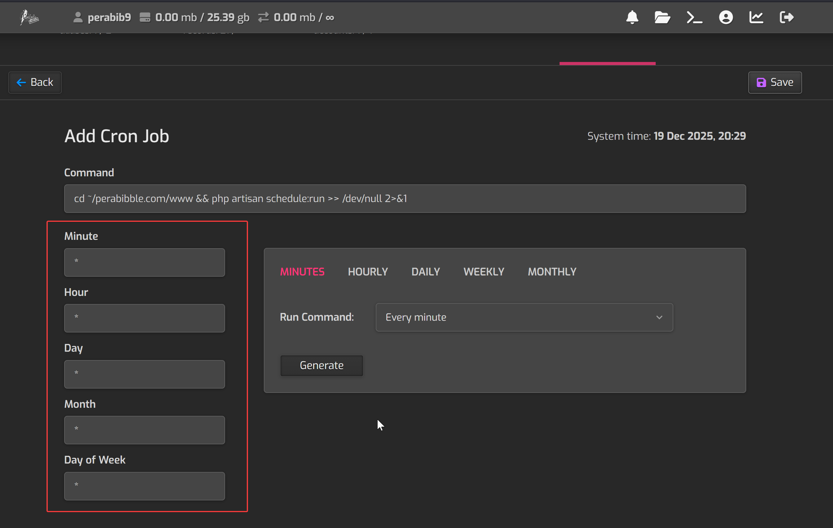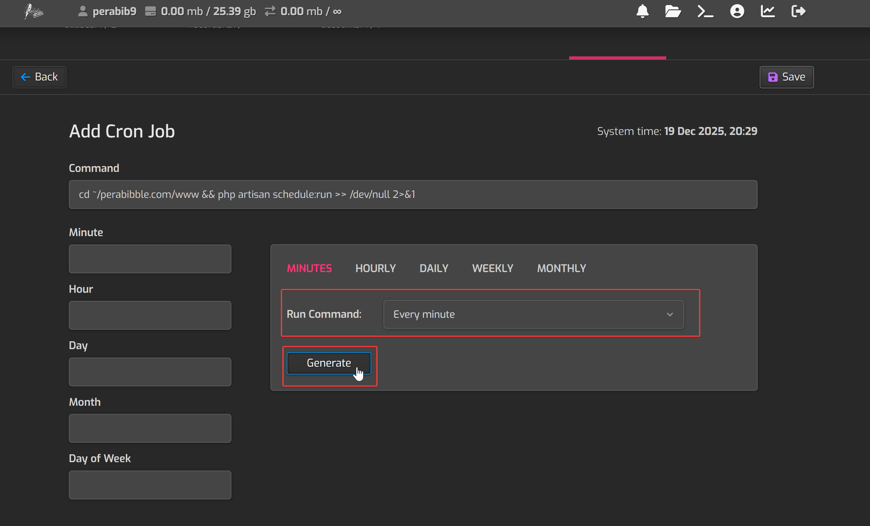 Next, next to "Run Command" select "Every Minute" and click "Generate".
