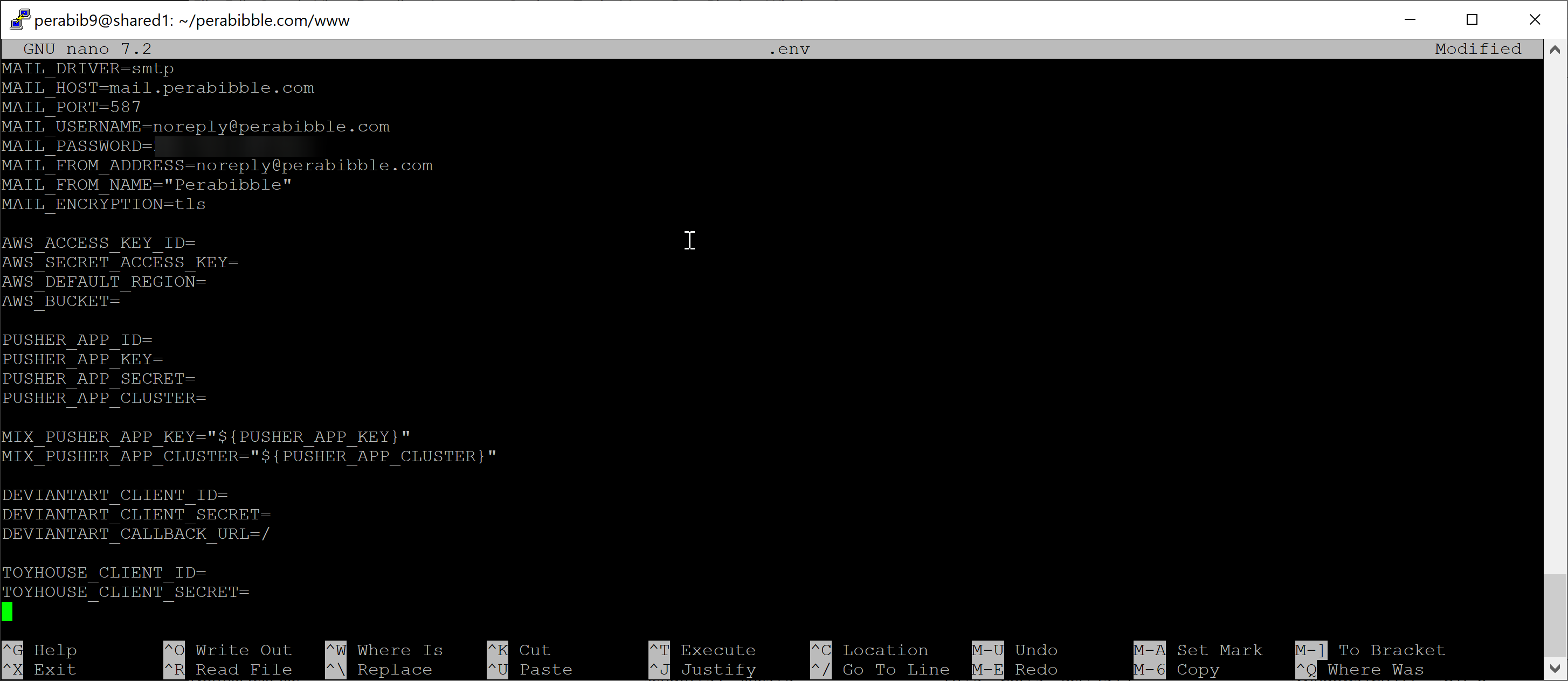 DB_USERNAME is the database username we selected earlier. For example: perabib9_user